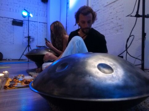 Затем вся аудитория уютно расселась на ковриках и Давиде начал играть на ханге. В третьей части он предложил всем разлечься по залу и закрыть глаза. Это была самая настоящая медитация. Пока гости концерта пребывали в нирване, Давиде перемещался по залу и продолжал играть на ханге.