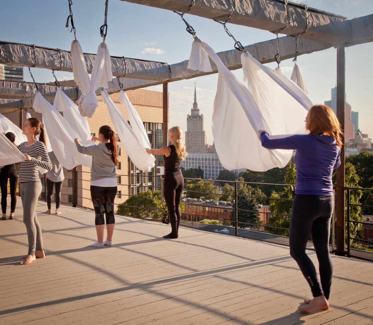 Мы проводим на крыше занятия по йоге, в том числе антигравити – йогу в гамаке. Такое же делаем во "Флаконе", но в Наркомфин больше народу ходит. Это удобное пространство, единственное, некоторые боятся заниматься в крайнем гамаке: там ощущается высота крыши.