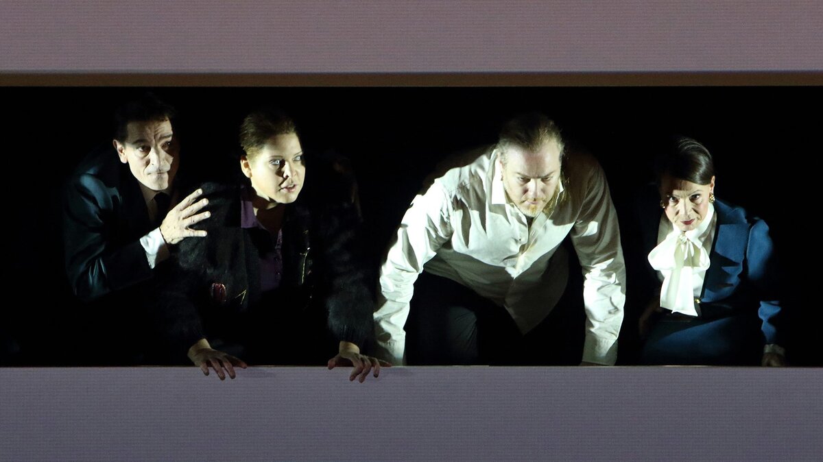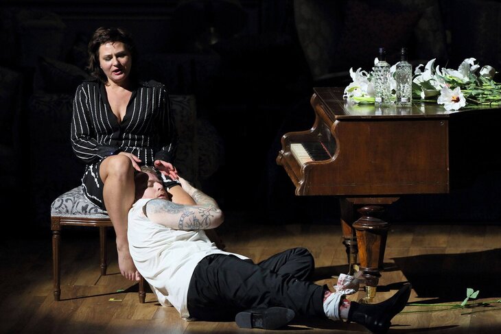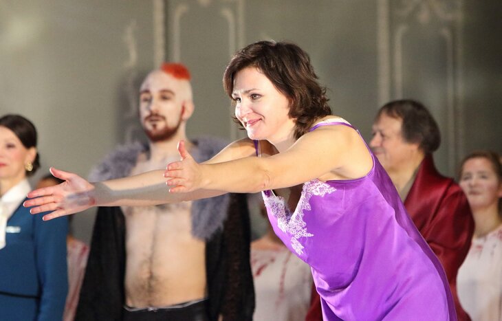 Первое появление героини на сцене вызывает смешок в зале – страдающая параноидальными расстройствами и галлюцинациями Рената, отгоняя незримого призрака, возникает из-под кровати и до изнеможения бьет себя кулаком в живот через подушку. Здесь, конечно, нужно отдать должное Светлане Создателевой, ее готовности к жестоким режиссерским задачам, требующим физической и психической выносливости, а также владения сценической пластикой. Коски не разрешает Ренате петь статично, и при этом не делает скидку на сложность партии, сравнимой с вагнеровской Изольдой. Создателева, как опытный марафонец, умело распределяет свои силы, сохраняя потенциал для финального рывка. Экстремальные перепады ее состояний – от полубезумного, срывающегося на декламацию, до нежнейших ариозо – даются Создателевой без видимого напряжения.