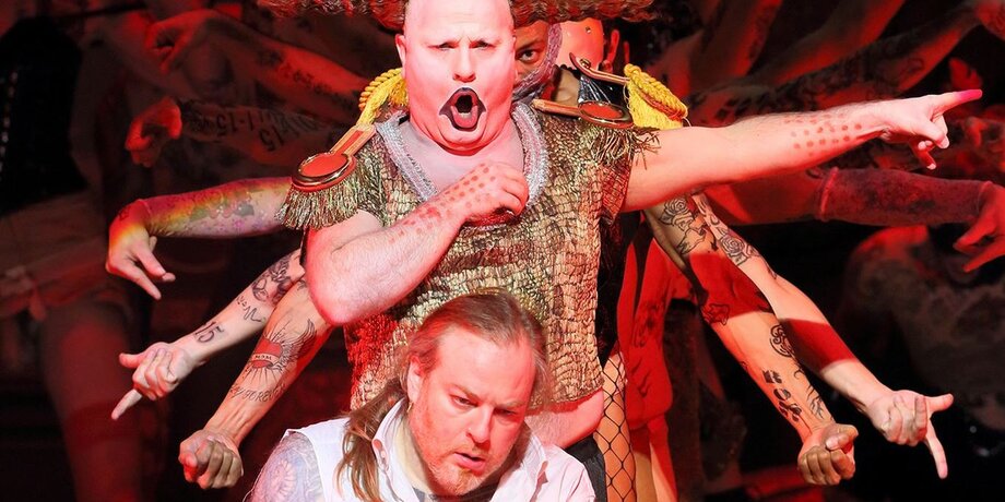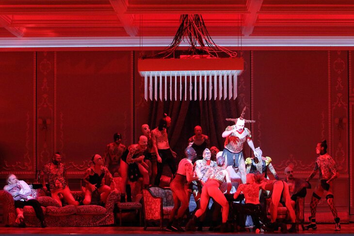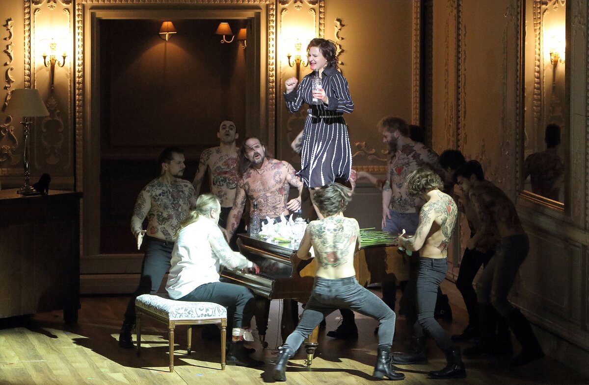 Режиссер Барри Коски, нынешний интендант берлинской Комише опер, мастер нестандартных решений (вспомнить хотя бы его анимационную "Волшебную флейту" в стилистике готических картин Тима Бертона), поместил героев "Огненного ангела" в пространство гостиничного номера (сценография – Ребекка Рингст). В элегантном интерьере нео-барокко Рената и Рупрехт поочередно испытывают друг друга "на прочность", а потом устраивают отвязные танцы на рояле в окружении татуированных полуголых мужчин. Сама идея – выбрать местом действия отель – не нова, и на ум приходит "Сияние" Стенли Кубрика и мистической триллер "1408" Микаэля Хофстрема. Коски следует по тому же пути, но организует все сложнее, пользуясь и эстетикой фильмов Хичкока и Линча (стекающая по стенам бордовая портьера в сцене визита Рупрехта к Агриппе – очевидная аллюзия на "красную комнату" из "Твин Пикс"). Круги ада замаскированы им под старомодный интерьер гостиницы. Покинуть эту условную преисподнюю невозможно ни при каком сценарии.