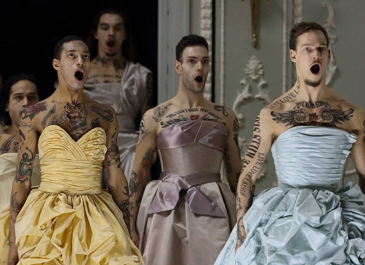 Коски широко пользуется гротесковой палитрой, не убирая ее даже в неприметных бытовых диалогах. Подчеркнутая карикатурность в какой-то мере свойственна всем второстепенным ролям. Из сцены появления Фауста и Мефистофеля режиссер делает живую и очень правдоподобную вечеринку садомазохистов. Приунывший от бесконечных удовольствий Фауст (Игорь Царьков, с этого сезона принятый в студию Баварской оперы) в латексном белье, чулках на подвязках и полушубке на голую грудь, изрекает свою знаменитую фразу: "Человек сотворен по образу и подобию самого Творца". В российском театре подобная мизансцена не обошлась бы без последующих открытых писем и актов протеста оскорбленных верующих, а в Мюнхене ее пропускают (и это при том, что основной контингент Баварской оперы – не продвинутая молодежь, а состоятельные пожилые ценители прекрасного), как и многие другие моменты "на грани". Другого участника мужской оргии, вечного спутника гетевского философа искрометно сыграл американец Кевин Коннерс. Несмотря на непристойный прикид с привязанными мужскими половыми органами, его Мефистофель выглядел даже чересчур очаровательно в своем комедиантстве. Азарт, с которым Коннерс подошел к роли, скрашивает несовершенство артикуляции. Как бы там ни было, донести деланную кажимость фарса ему удалось в полной мере.