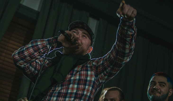 Алексей Кингсайз Храпов читает рэп-фристайл на питерском баттле V1 Battle. Фото: Дмитрий Тибекин