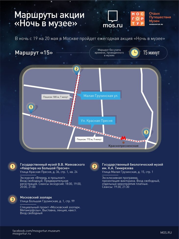 Для удобства москвичей "Мосгортур" подготовил несколько маршрутов, от самого короткого до самого длинного. Не считая времени, проведенного в музее, их продолжительность составляет от 15-ти до 45 минут.