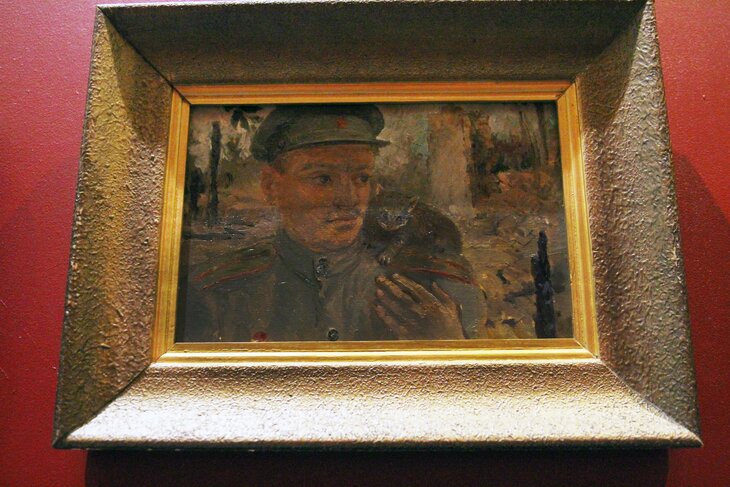 Картина "Гвардии младший лейтенант Горбунов Ю.С. с кошкой" Евгения Комарова была написана в 194 году на Белорусском фронте. В музее пытались узнать дальнейшую судьбу лейтенанта Горбунова. Выяснилось, что все люди с такой фамилией и инициалами погибли.