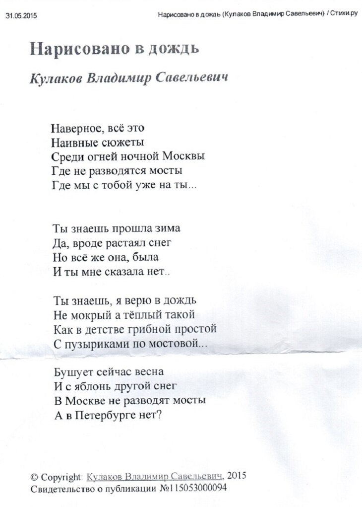 Поэт Кулаков Владимир Савельевич напечатал свое стихотворение под названием "Нарисовано в дождь" и оставил возле нашей "Двери к признанию". Произведение у него грустное, особенно последние две строчки заключительного четверостишия.