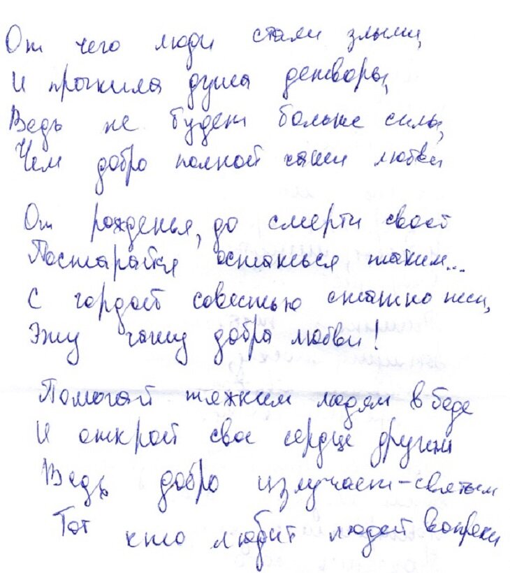 Максудова Юлиана поделилась с нами своим поэтическим монологом с грустью. Но на другой стороне листочка мы обнаружили еще одно ее стихотворение, в котором поэт размышляет, отчего это люди вокруг стали такими злыми и говорит затем, что лучше быть добрым и любить людей.
