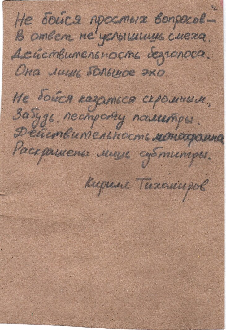 Но мы не забыли про тех, кто не решился (или не захотел) в этот день подняться к микрофону и оставил свои стихи в специальной зоне "Дверь к признанию". В конце дня мы собрали все эти листики, а теперь будем два раза в неделю публиковать их здесь.