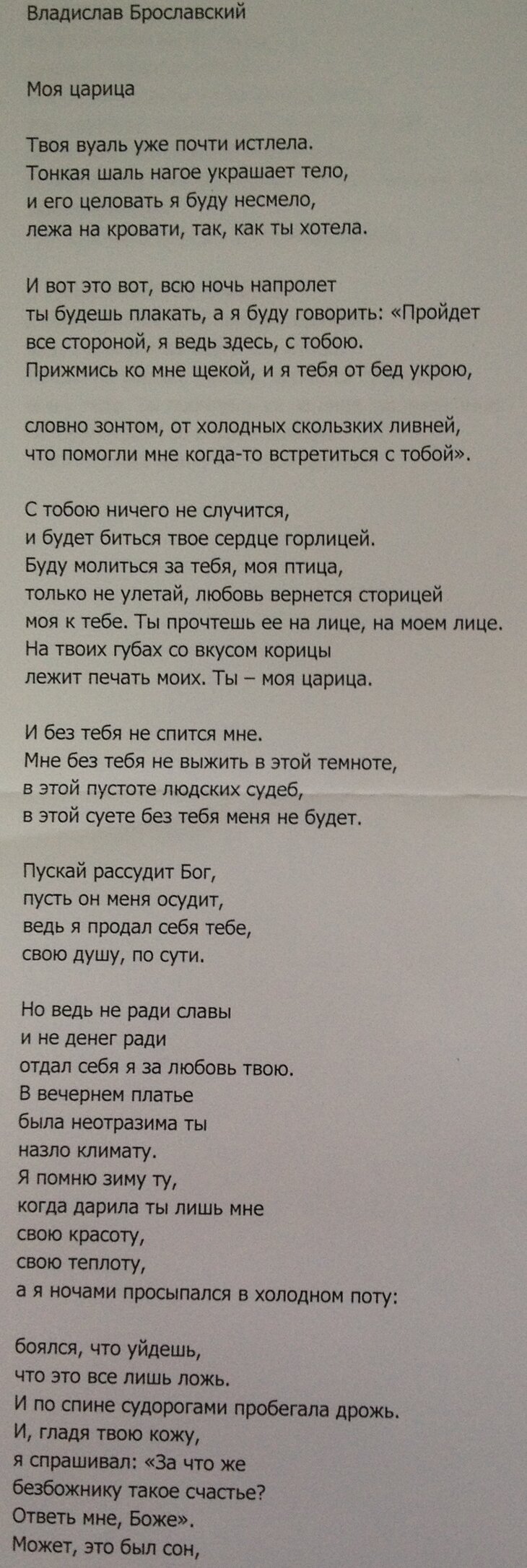 Поэт с красивым именем, а также ничуть не уступающей ему красоты фамилией Владислав Брославский, оставил нам стихотворение под названием "Моя царица".