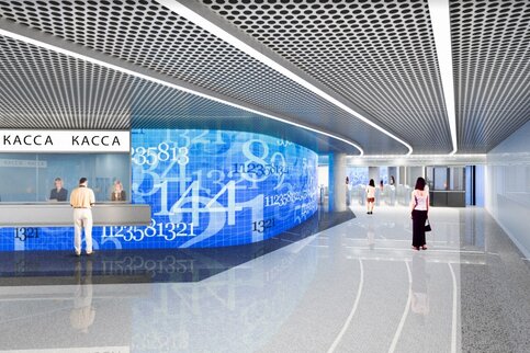 Рабочие устанавливают на колонны панели с рисунками, выполненными на синем фоне с графическими элементами в виде пересекающихся рядов цифр. Цифры символизируют точные науки и отражают связь станции с научной деятельностью Михаила Ломоносова.
