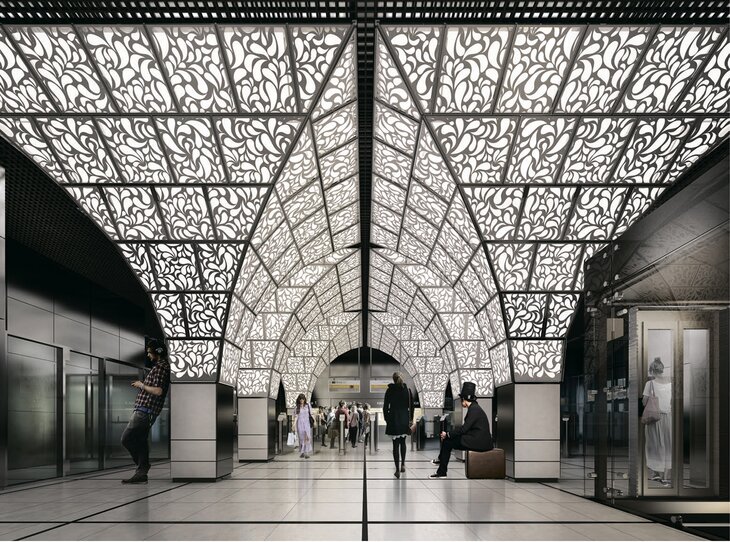 На платформе узоры повторяются в светильниках, встроенных в навесной потолок. Через стальные пластины рассеивается свет и расширяется подземное пространство.