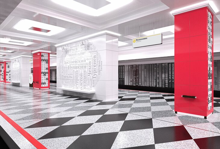 А пассажиры "Рассказовки" попадут в библиотеку: интерьеры новой станции оформлены в стиле читального зала. Стены вдоль путей отделаны металлокерамическими панелями, на которых нарисованы корешки книг известных авторов. А колонны на платформе превратились в шкафы-картотеки: на лицевую поверхность "картотечных ящиков" нанесены QR-коды, с помощью которых пассажиры смогут скачать литературные произведения.