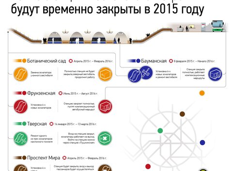 Сейчас проходит ремонт на закрытой станции "Бауманская". Его проведут с февраля по декабрь текущего года. Вместо трех эскалаторов там появятся четыре. А работы на станции "Проспект Мира" (кольцевая) начнутся в апреле 2015 года и завершатся в апреле 2016-го. Там также появится четвертый эскалатор.