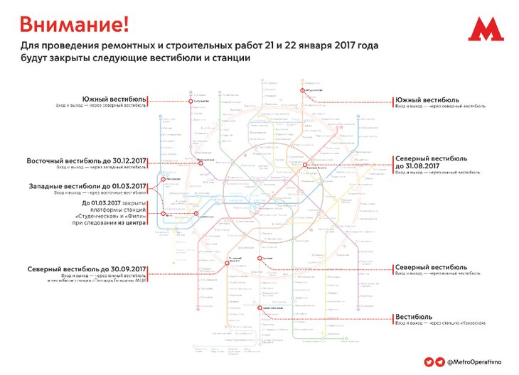 До 1 марта 2017 года закрыты западные вестибюли станций "Фили" и "Пионерская". Вход и выход – через восточные вестибюли.