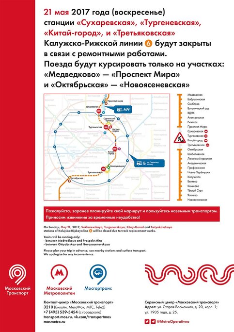 Центральный участок Калужско-Рижской линии между станциями "Октябрьская" и "Проспект Мира" будет закрыт весь день 21 мая для проведения ремонтных работ, сообщает пресс-служба Московского метрополитена.