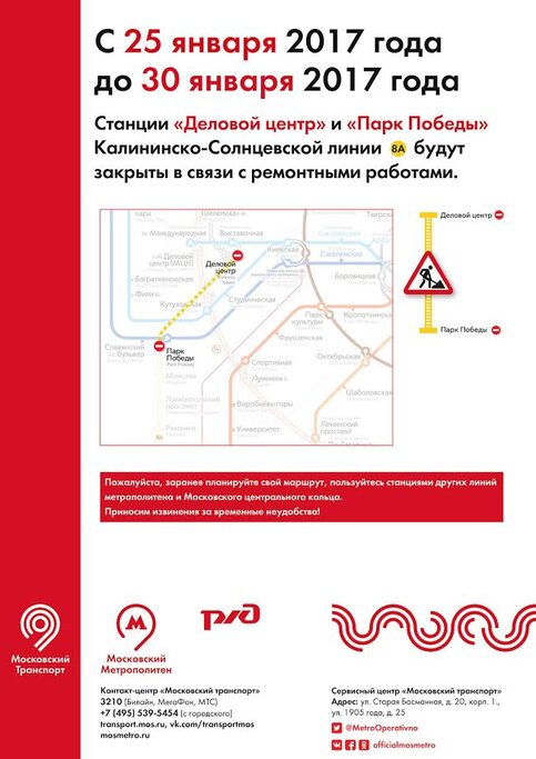 Для пассажиров будут временно закрыты станция "Деловой центр" и переход между станциями "Деловой центр" и "Выставочная". А вот "Парк Победы" будет работать только для проезда по Арбатско-Покровской линии.