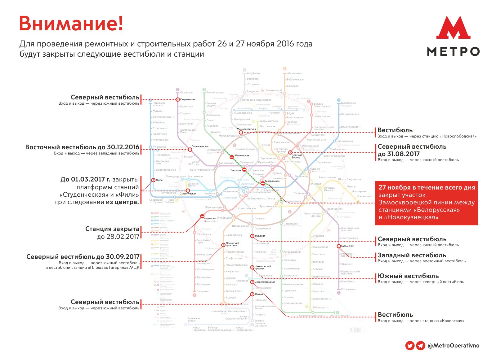 Также 27 ноября на весь день будут закрыты на ремонт станции "Маяковская", "Тверская" и "Театральная".