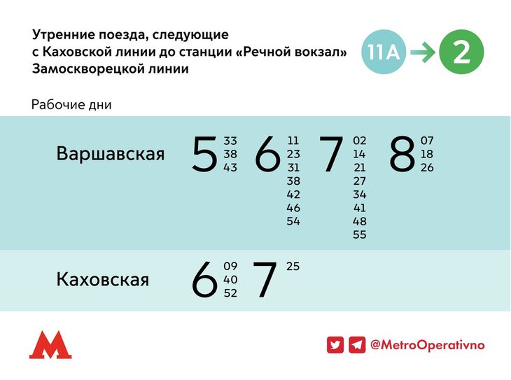 Поезда отправляются со станции "Варшавская" Каховской линии и едут напрямую до "Речного вокзала" Замоскворецкой ветки метро.