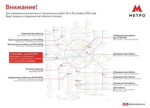 В Московском метрополитене также напомнили пассажирам, что восточный вестибюль станции "Сокол" будет закрыт до 10 ноября, до 31 декабря – вестибюль и подуличный переход "Полежаевской", до 31 августа 2017 года – северный вестибюль станции "Красные ворота".