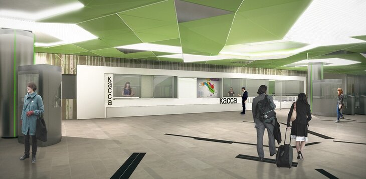 Второй вариант набрал 39% голосов. Его авторы предлагали нейтральное цветовое решение – интерьер вестибюля выдержан в холодных тонах. Главным украшением должны были стать потолочные светильники в виде переплетающихся ветвей деревьев.