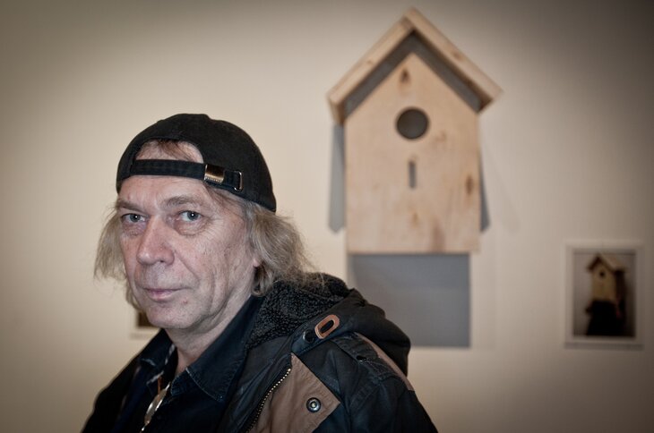 Владимир Козин на фоне инсталляции с клетками для птиц. Фото: M24.ru/Владимир Яроцкий