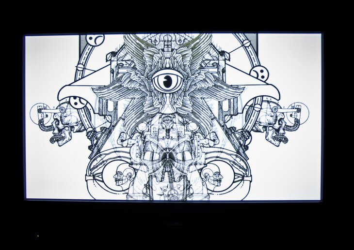 "Мне нравится хрупкая, старая бумага. Я всегда работаю с рулоном и потом отрываю готовую картину. Я выбираю бумагу по тактильным качествам, а не по тому, как долго она будет жить. Если говорить о смысле работ, важно сказать, что я не планирую что-то заранее, я просто начинаю рисовать. Это свобода. Я начинаю рисовать и просто иду за линией. Это желание приблизиться к некой свободе. Основные темы - это человек, и человек борющийся, конфликтующий с каким-то авторитетом".