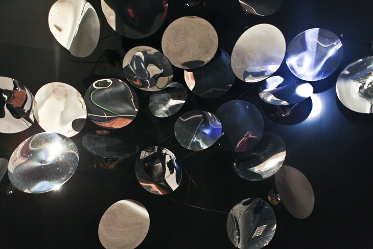 "Почему инсталляция называется “Даная”? Это известный сюжет – его создавали и Рембрант, и многие другие. Если посмотреть на работу, можно увидеть Данаю: ее локоток, голову, ногу. Кто помнит рембрантовскую Данаю, знает, что, когда падает свет на любую часть тела, она реагирует. В отличие от Рембранта (там реагирует только одно место), у нас реагирует все. И когда свет падает на зеркало, оно съеживается, то есть принимает на себя этот божественный свет. У работы есть и вторая трактовка, вариант более мудрый с точки зрения физики и современной науки. Вы должны физически ощутить давление света. Все продумано: и давление луча, и его движение. Все с научной точки зрения имеет ответ".