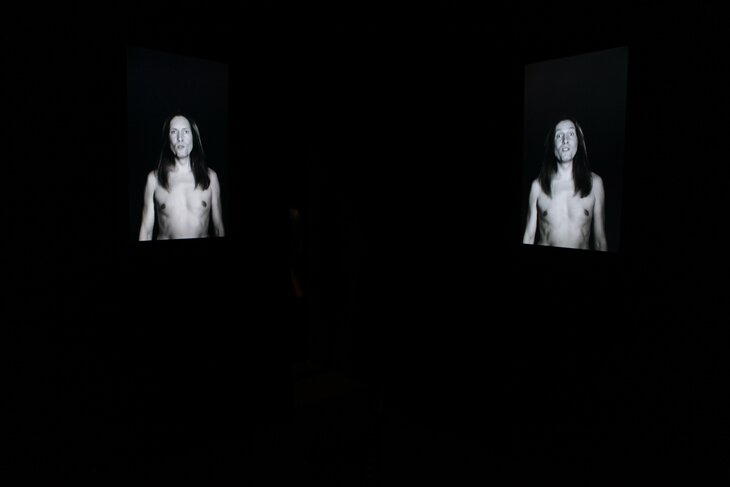 "Одна из жемчужин нашей выставки. Видеоинсталляция "Обращение" представляет собой церковный псалом, который поет человек, который работает в хоре. Художник попросил исполнителя спеть все голоса четырехголосного псалма. Каждая плазма поет разную арию. Вы стоите в середине комнаты и слышите многоголосье, которое соединяется в вашей голове. Это псалом, говорящий о том, что человек должен вернуться в объятия своего отца, он исполняется при обращении в монашество. Певец обнажен по пояс. Здесь речь идет о теле как о музыкальном инструменте – демонстрируются легкие".