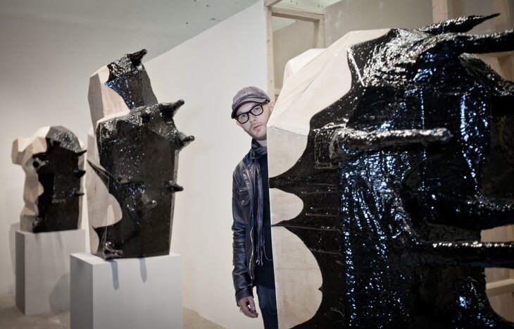 "Лет шесть назад я был в Берлине, это была моя первая полномасштабная поздка в Европу, я там жил полтора месяца. Я ходил по музеям. Берлинский исторический музей напичкан античными торсами. В тот момент это мне понравилось эстетически. Потом возникла тема пустоты. Когда вещи куда-то переезжают, остается ли в них после переезда что-то, или мы перевозим просто формообразующие конструкции, в которых ничего нет? Так появилась идея сделать анатомические ящики для скульптур. Мы догадываемся, что там могут быть античные торсы. Есть ли они там или нет, мы не знаем. Также есть момент очищения, эта черная масса. Мы не понимаем, то ли коробка вырывается из нее, и это движение влево, то ли масса сливается с коробкой. Скульптуры три - это число мне близко, плюс оно имеет мифологию. Проект посвящен истории искусств, ее движению. Поднимается вопрос о том, что мы ценим из истории искусств".