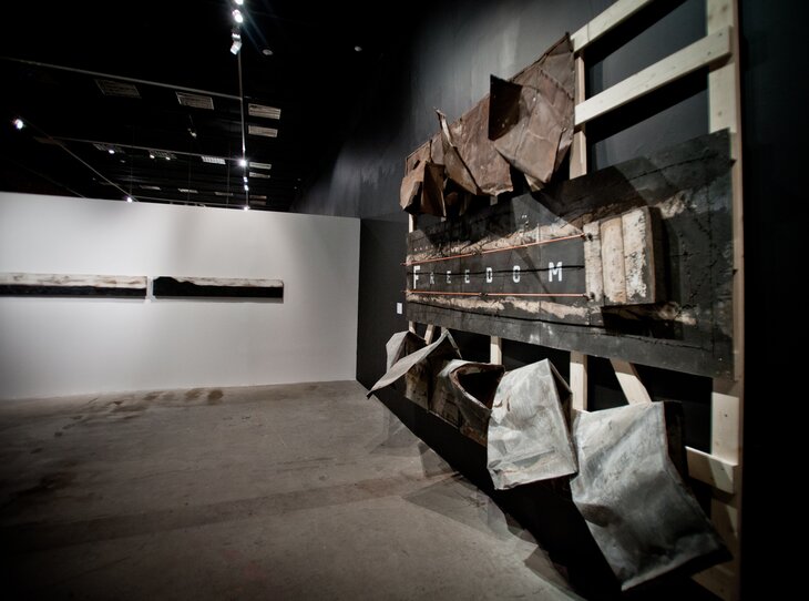 "Это история про художников, которые обходятся мелочью, простыми материалами и работают без оглядки на то, выставляют ли их музеи или их работы будут висеть в подъезде. Например, в подъезде на Пушкинской, 10. Там живет Юрий Никифоров, автор работы Freedom. Он берет старые листы металла, натяжную проволоку, резину для крепления багажа в машине. Здесь части резины зацепляются друга за друга и ассоциируются с цепью. И слово "свобода", написанное на картине, выражается еще сильнее".