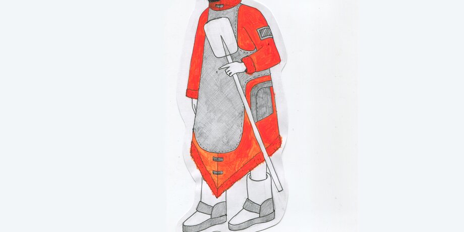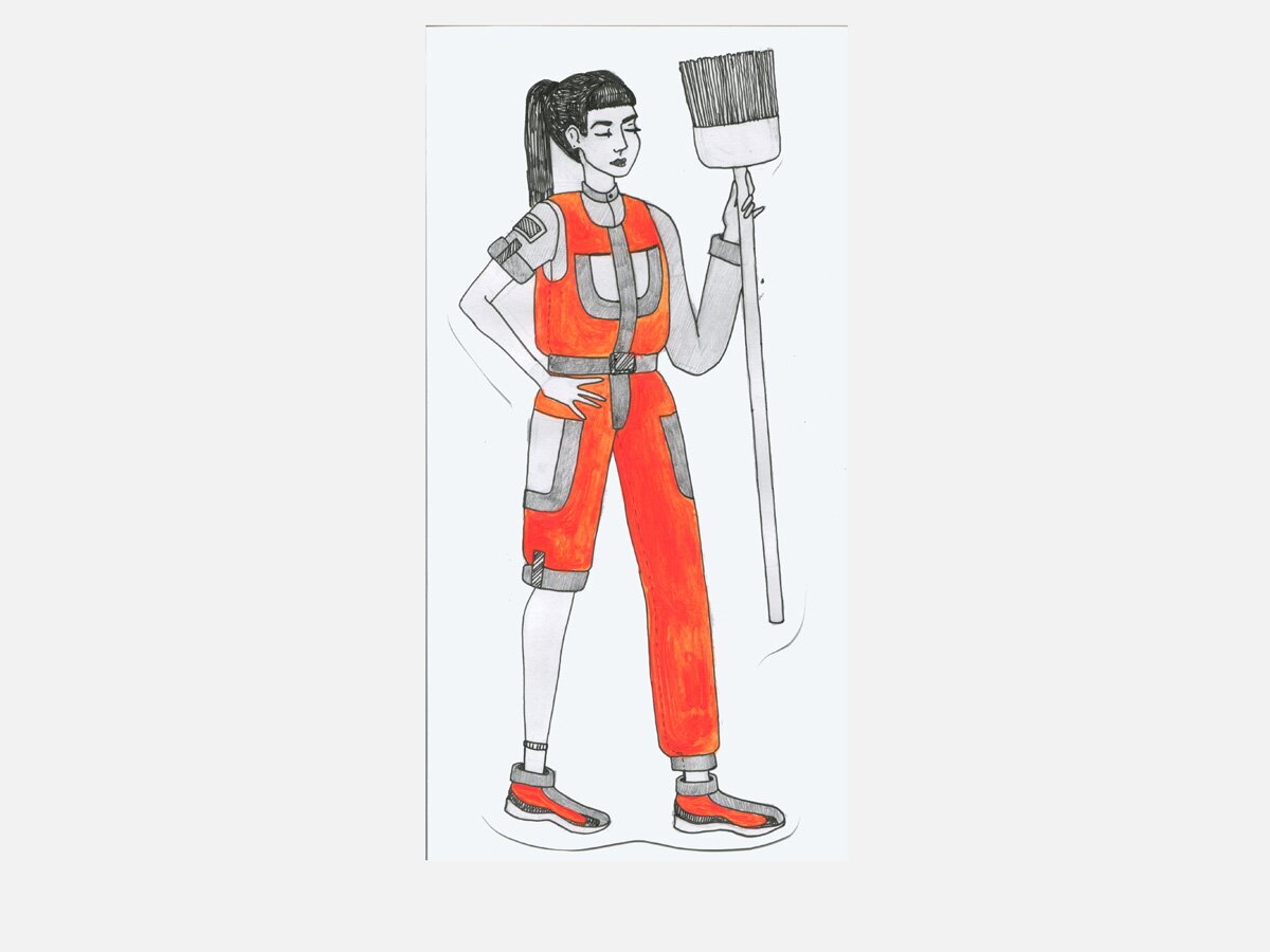 Созданный мной костюм – это интерпретация всем знакомой униформы. Она основана на анализе одежды, которую носят дворники в разных странах. Вот несколько иллюстраций, отражающих представление о дворнике в искусстве. Цвет выбрать было нетрудно, так как зачастую дворники работают в кислотно-оранжевых жилетах. Я решила оставить этот вариант, но добавить детали, которые сделают униформу комфортнее.