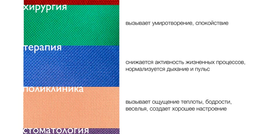 Когда речь идет о врачебной униформе, отказаться от белого цвета нельзя, но можно внести разнообразие. Я предложила дополнить монохромный костюм цветной вставкой, зависящей от специализации врача. На слайдах ниже разъясняется влияние выбранных мной цветов на психоэмоциональное состояние окружающих. В своем проекте я использовала актуальное в последнее время решение color bloсking – сочетание цветов.