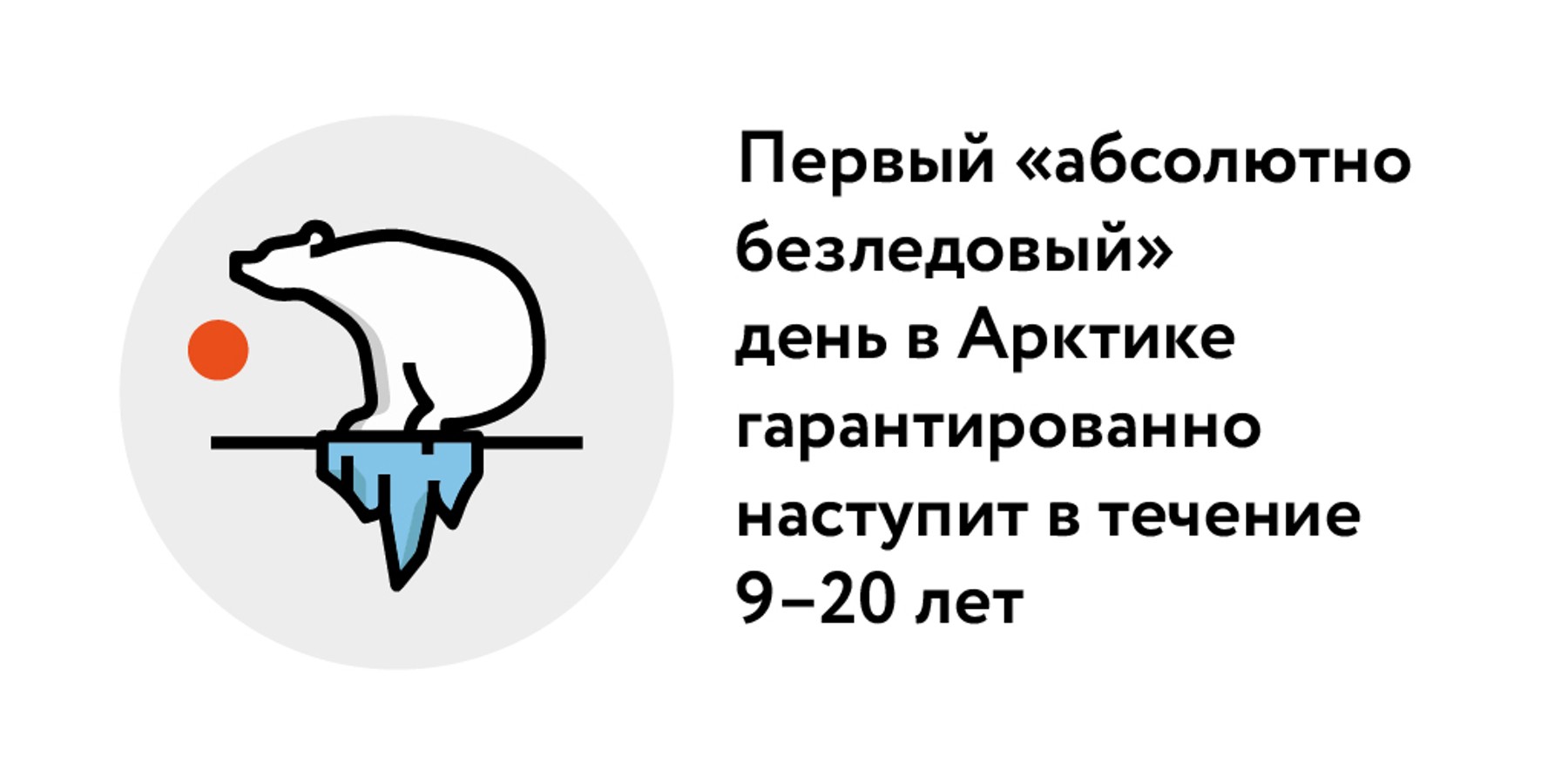 Недавно группа специалистов из Гетеборгского университета провела 300 компьютерных симуляций, которые предсказали, что первый "абсолютно безледовый" день в Арктике гарантированно наступит в течение 9–20 лет независимо от того, как люди изменят ситуацию с выбросами парниковых газов. Более того, 9 из 300 прогнозов показали, что это может случиться уже в 2027 году.