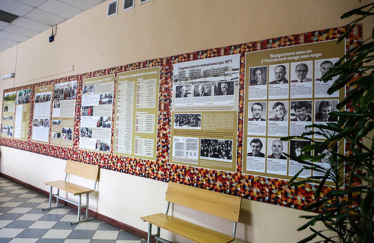 Холл СУНЦ МГУ – это большая доска почета. На стенах – стенды об истории школы, фотографии выпускников – ныне академиков и членов-корреспондентов Российской академии наук, перечень 73 победителей международных олимпиад. Возле пальм стоит тенистый стол. На кожаном диване – две девушки. Одна в платье и лакированных туфлях на 10-сантиметровом каблуке, другая в красных кедах, джинсах, с накладными наушниками. Мимо пробегает мальчик в черных сланцах. Следом идет юноша в костюме с красным галстуком. На многих ребятах – фирменные футболки с разных соревнований.