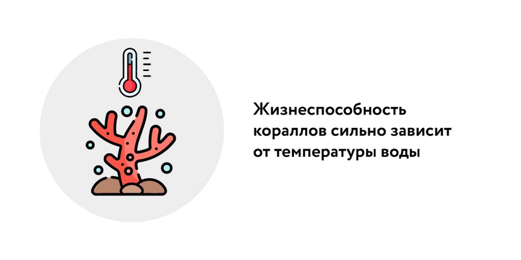 Жизнеспособность кораллов сильно зависит от температуры воды, но кажется странным, что их убивает не только охлаждение среды, но и незначительный нагрев. Оказалось, что при потеплении в воде появляется слишком много микробов, отчего снижаются содержание кислорода и кислотность среды, а это сочетание смертельно для коралловых полипов. Разумеется, на мертвом рифе пропадает и остальная жизнь: его обитателям не хватает пищи. Рыбы, моллюски, ракообразные и все остальные яркие представители кораллового биома погибают или покидают бесцветный риф.