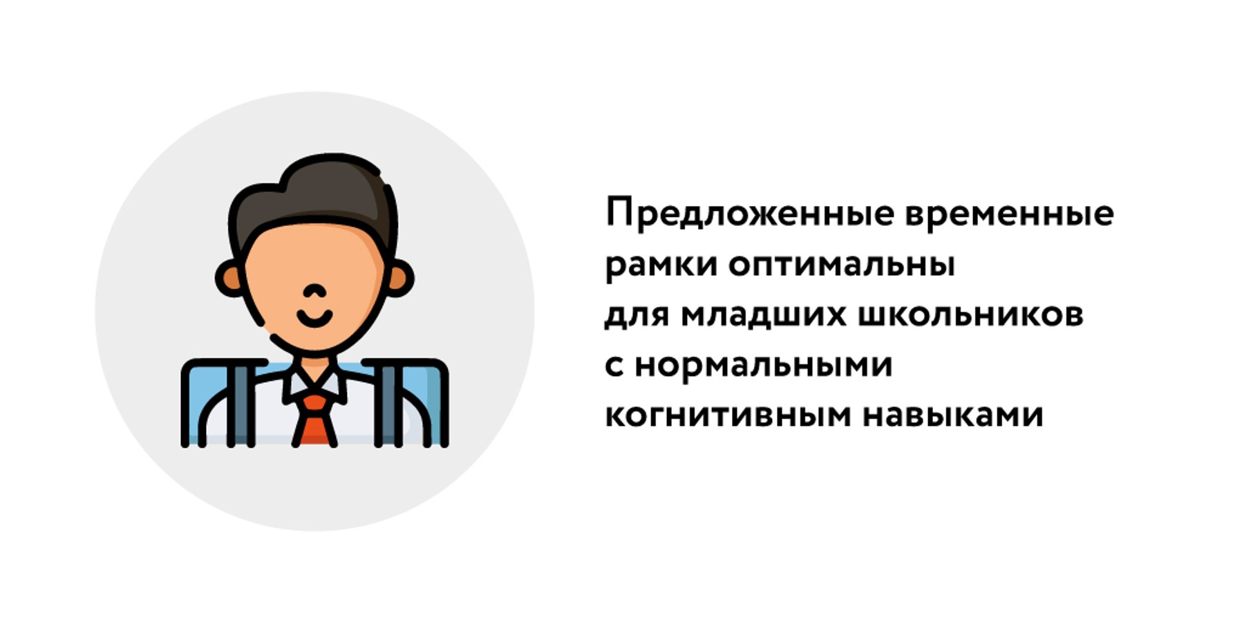 Нейропсихолог и член Союза охраны психического здоровья человека Нина Петровская заявила Москве 24, что временные рамки, предложенные Минпросвещения, оптимальны для младших школьников с нормальными когнитивным навыками. Причем в первую очередь такой подход будет полезен для родителей, а уже потом для самих детей.
