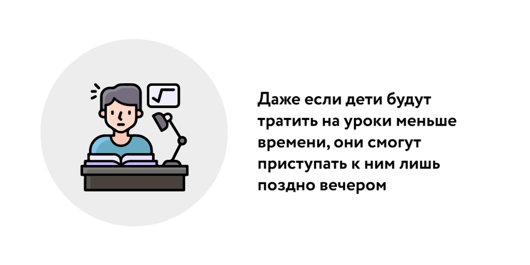 Усложняется ситуация и внеурочной активностью в виде кружков и секций, считает эксперт. Поэтому даже при условии, что дети будут тратить на уроки меньше времени, они все равно смогут приступать к ним поздно вечером.