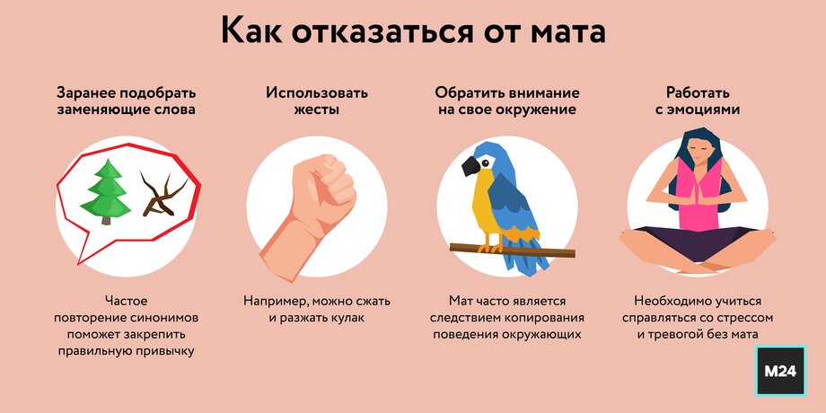 Побороть желание использовать ругань помогут заранее подобранные заменяющие слова или жесты, например, сжать и разжать кулак. Частое повторение синонимов вместо мата поможет закрепить правильную привычку. Начать стоит с пары слов, отметила психолог.
