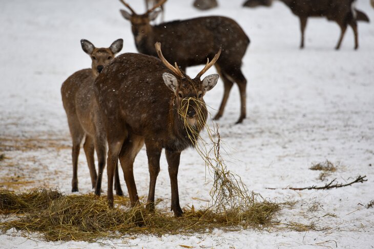 Петляет тропка, вместе с ней петляем мы. И вдруг – долгожданная удача! Мы выходим к прикормочной площадке, у которой расположились, по меньшей мере, с полсотни пятнистых оленей и пара кабанов. Все мирно соседствуют, подъедая заботливо заготовленное сено. Почти как в джунглях во время засухи у водопоя – звери забывают всякие распри. Но вот человек тут явно лишний.