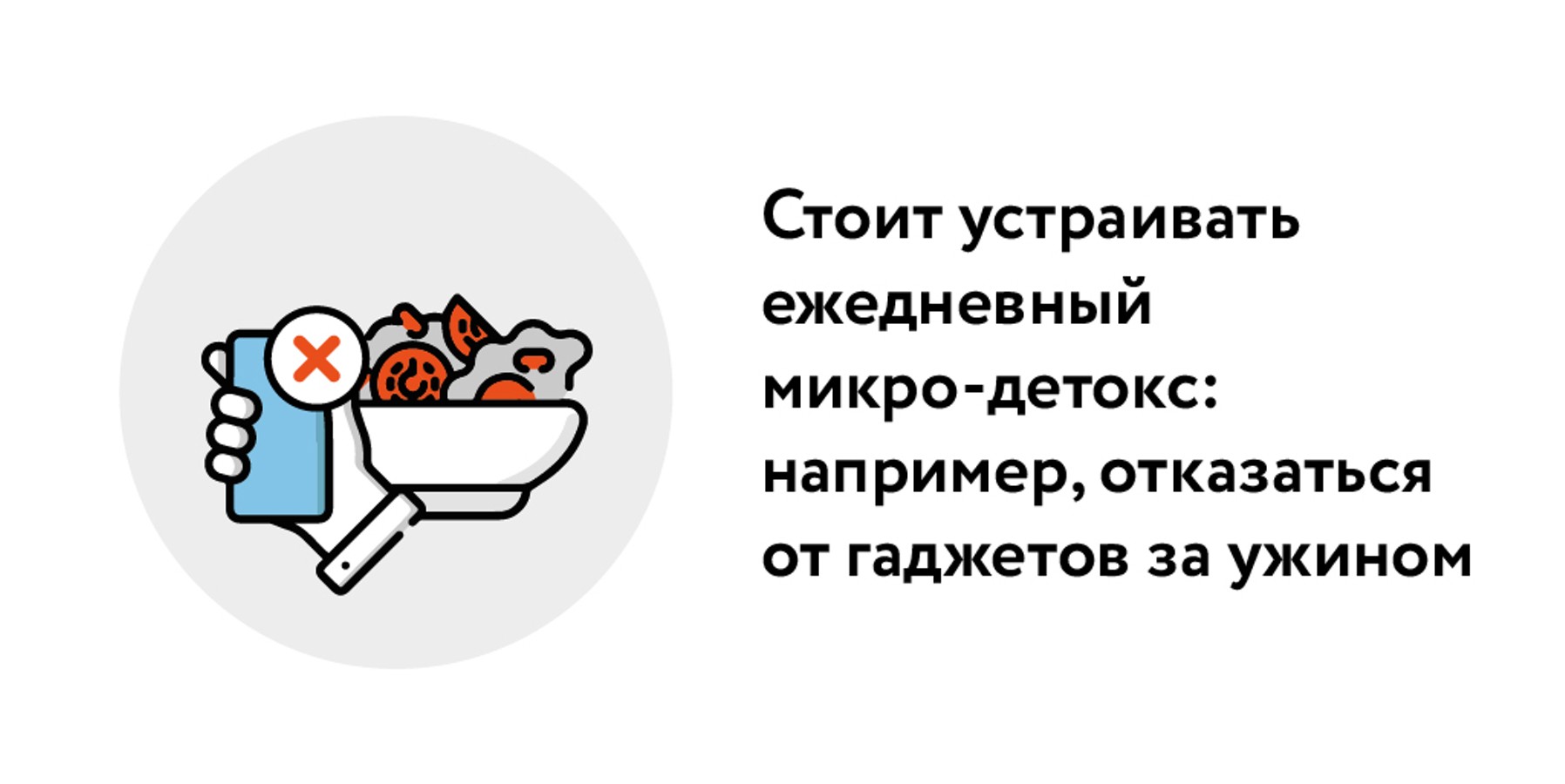 Также стоит устраивать ежедневный микро-детокс. Например, отказаться от гаджетов в обеденное время или вечером за ужином. Отдых от онлайн-жизни позволит посвятить время общению с друзьями и близкими.