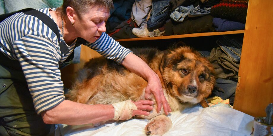 Спустя неделю Марфа начала потихоньку приходить в себя. Сейчас Людмила постоянно делает ей ванночки для лапок, смазывает их специальной мазью, чтобы быстрее подсыхали, и ставит обезболивающие уколы. "Ласточка ты моя, девочка любимая", – старается утешить собаку женщина, слыша ее мучительное поскуливание. Марфуша уже начала делать первые шаги, выходить на улицу, но это не так-то просто. Для того, чтобы лапки не повредились и не промокли, хозяйка делает ей перевязку, потом кладет прокладку, надевает на каждую лапку носок и пакет, и фиксирует все это липучкой. Но идти животному все равно пока больно и тяжело.