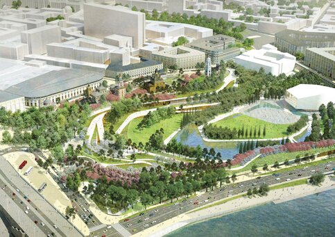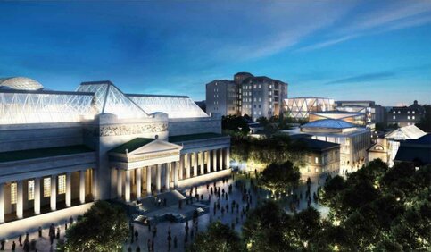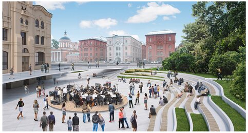 Волхонка превратится в четырехполосный бульвар с зеленой зоной, рядом с усадьбой князей Вяземских-Долгоруковых откроется современный парк, за зданием отдела личных коллекций вырастет новый музейный комплекс, а на открытых пространствах можно будет увидеть некоторые экспонаты Пушкинского музея.