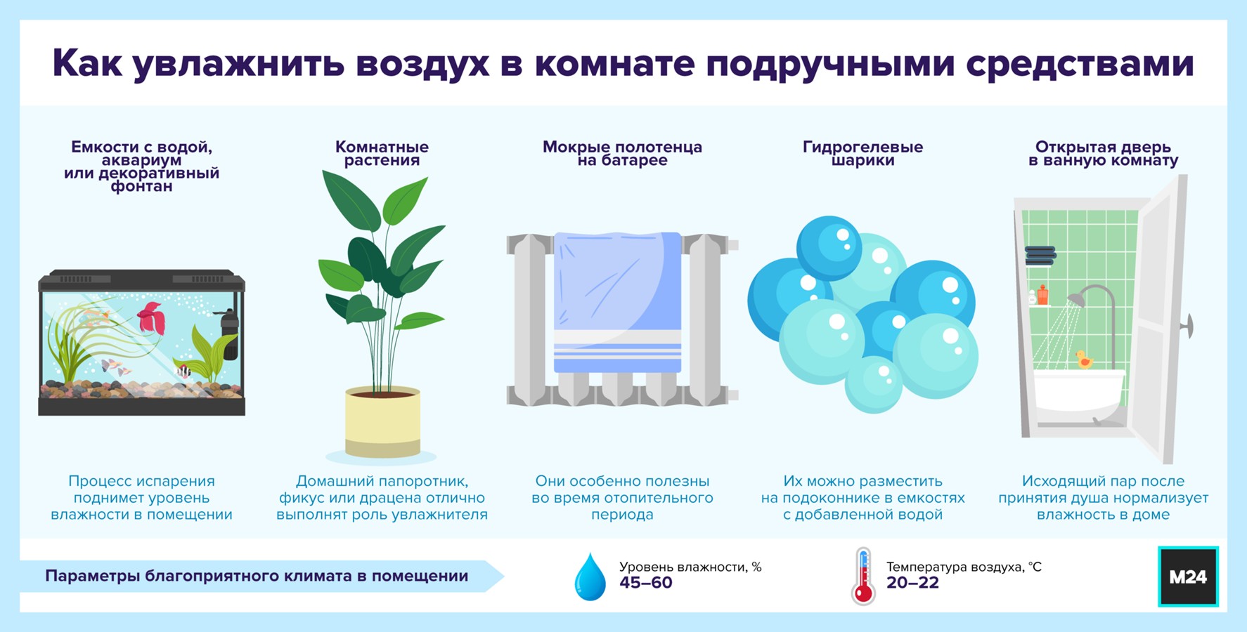 Если нет возможности увлажнить воздух с помощью профессиональных приборов, то можно прибегнуть к подручным методам.
