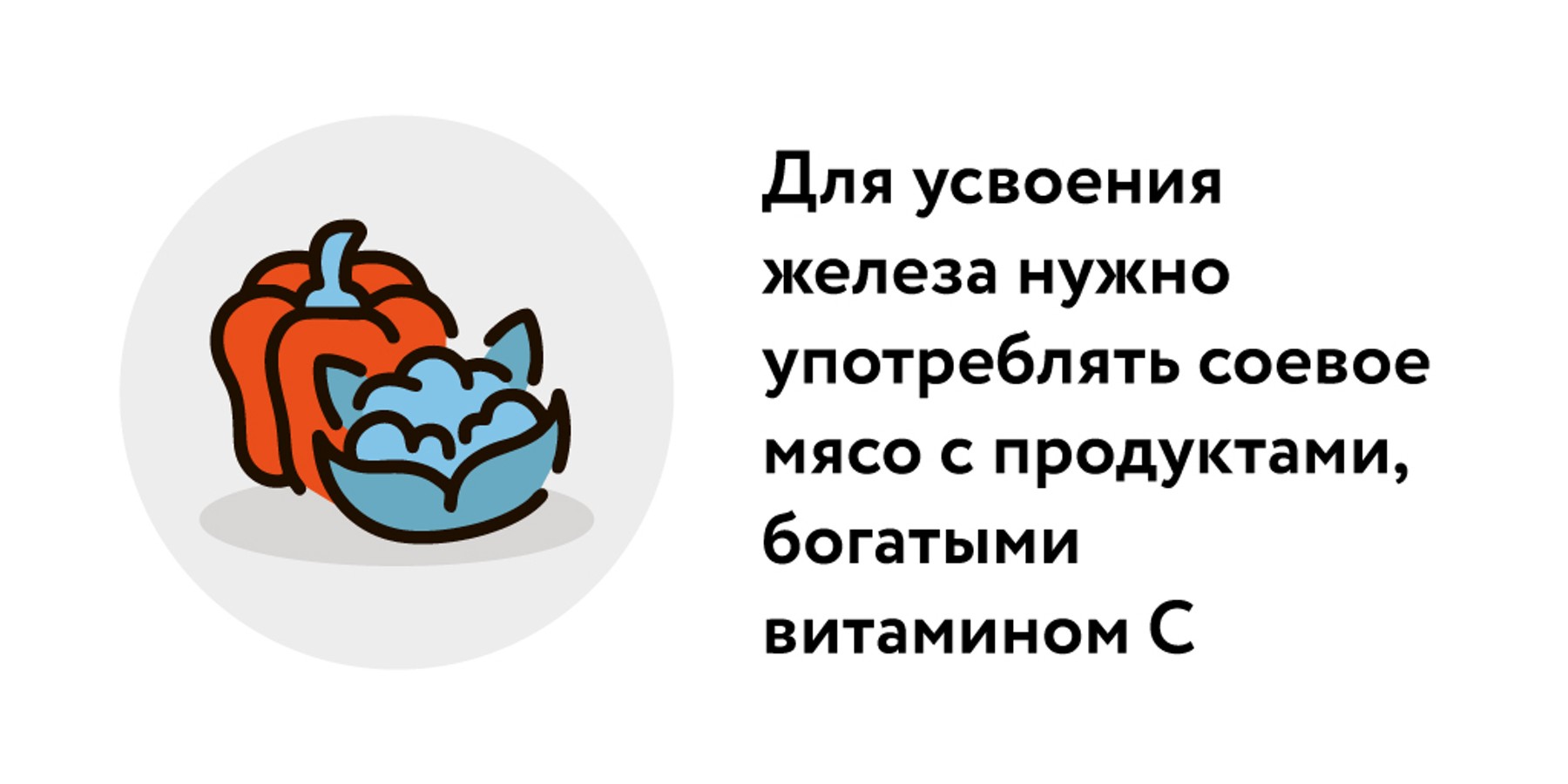 Помимо этого, в составе есть минералы, кальций, магний, фосфор и железо. Для того, чтобы в организме усваивался последний элемент, врач посоветовала употреблять соевое мясо с продуктами, богатыми витамином С.
