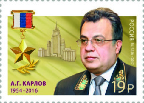 Марка с изображением героя России, посла Андрея Карлова выйдет в обращение 10 февраля, сообщает пресс-служба компании "Марка", отвечающей за выпуск почтовых знаков.