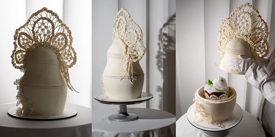 Шеф-кондитер Ольга Рыбакова создала авторский кулич в виде полуметровой шоколадной матрешки. Кокошник сделан из съедобных нитей в технике макраме, все узоры также нанесены вручную. Внутри спрятан традиционный кулич "Царский", изготовленный с добавлением белой черешни, шафрана, весенних цветов в комплекте с шоколадными яйцами.