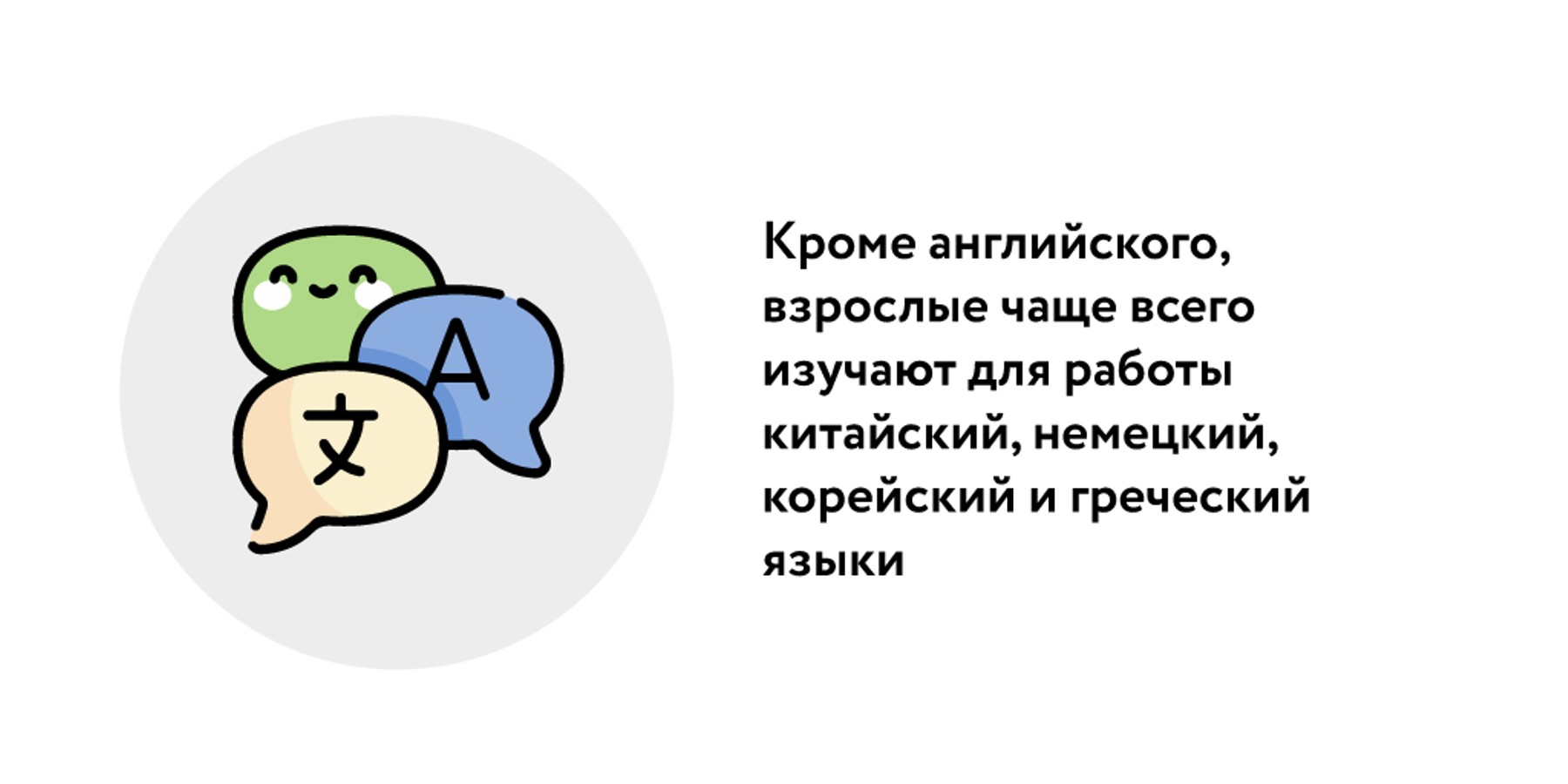 Академический директор одной из школ иностранных языков Анастасия Екушевская добавила, что, кроме английского, взрослые чаще всего изучают для работы китайский (55%) и немецкий (50%), затем корейский (34%) и греческий (33%). Для собственного удовольствия популярны японский (33%), французский (31%) и испанский (25%).