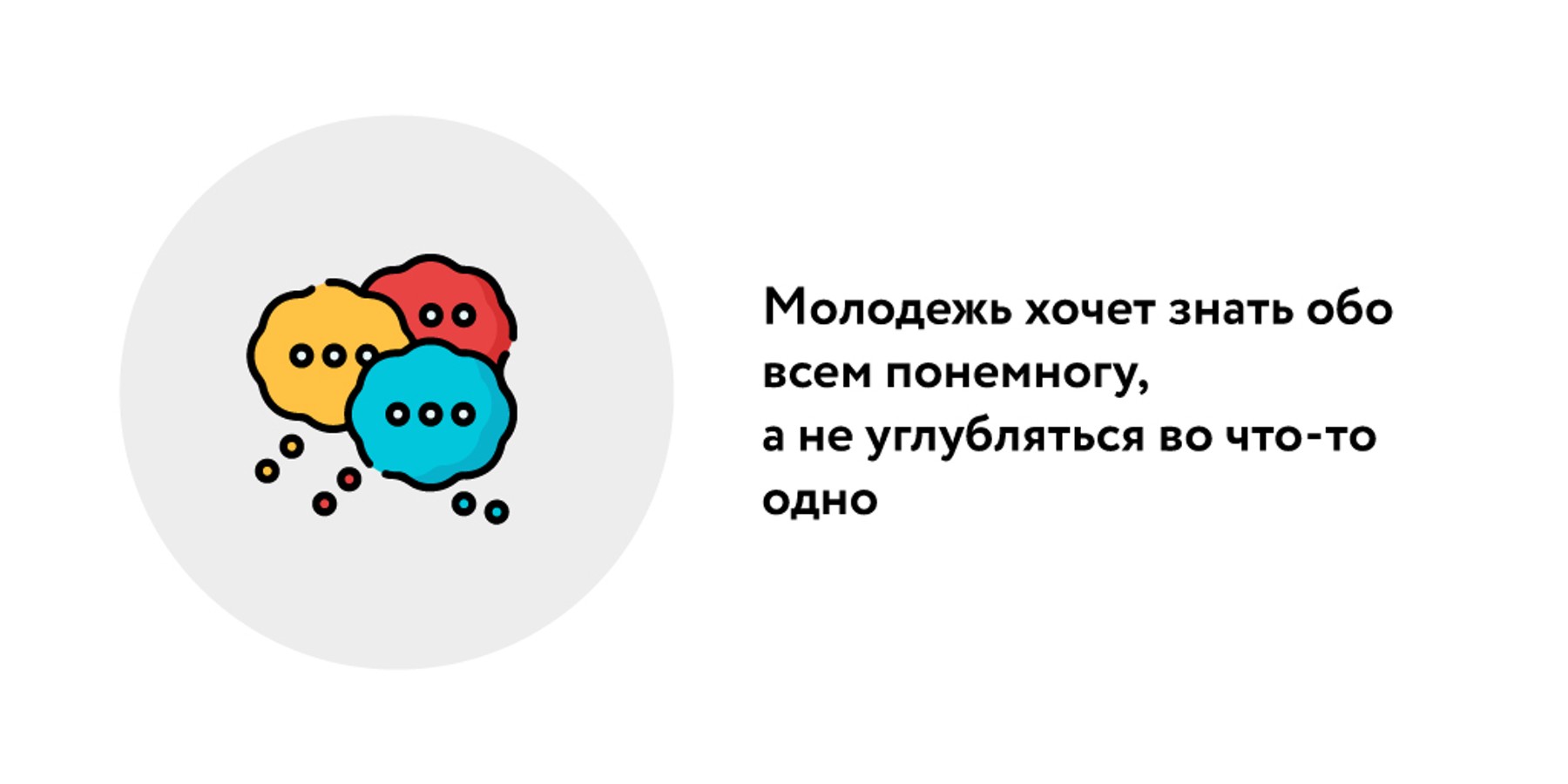 Психолог отметила, что молодежь заинтересована в том, чтобы знать обо всем понемногу, а не углубляться во что-то одно. И это отвечает запросам современности, ведь сейчас более востребованы специалисты, которые обладают гибкими навыками и способны оперативно адаптироваться к новым условиям.