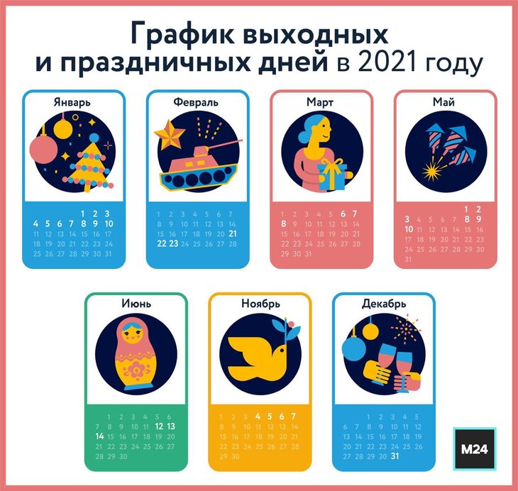 Сделать 31 декабря выходным в 2021 году удалось за счет грядущих январских праздников. В этот раз страна уйдет на новогодние каникулы с 1 по 10 января, при этом 2-е и 3-е выпадают на субботу и воскресенье.