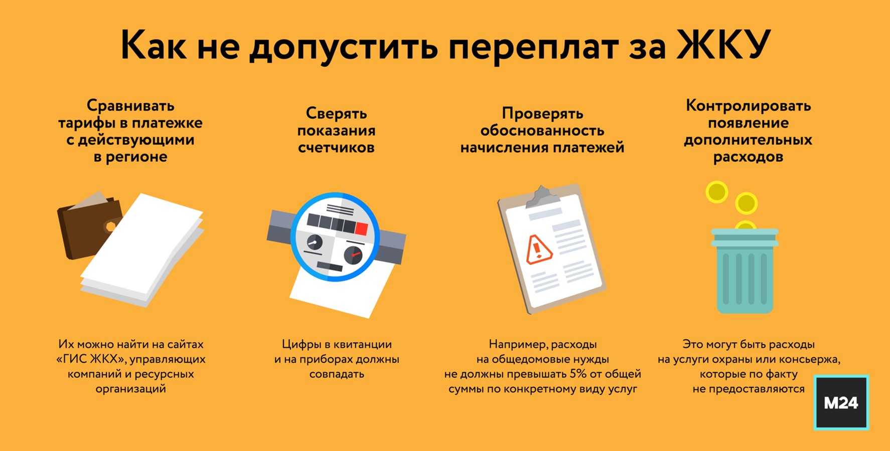 Чтобы не допустить переплат, эксперт по ЖКХ Дмитрий Бондарь в разговоре с Москвой 24 посоветовал сравнивать указанные в платежном документе тарифы с реально действующими в регионе. Их публикуют на онлайн-платформе "ГИС ЖКХ", а также порталах управляющих компаний и ресурсных организаций.