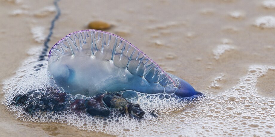 Эксперт уточнил, что португальский кораблик плавает на самой поверхности и виден лишь его разноцветный фиолетово-багровый воздушный пузырь, похожий на шарик, в то время как щупальца находятся в толще воды.